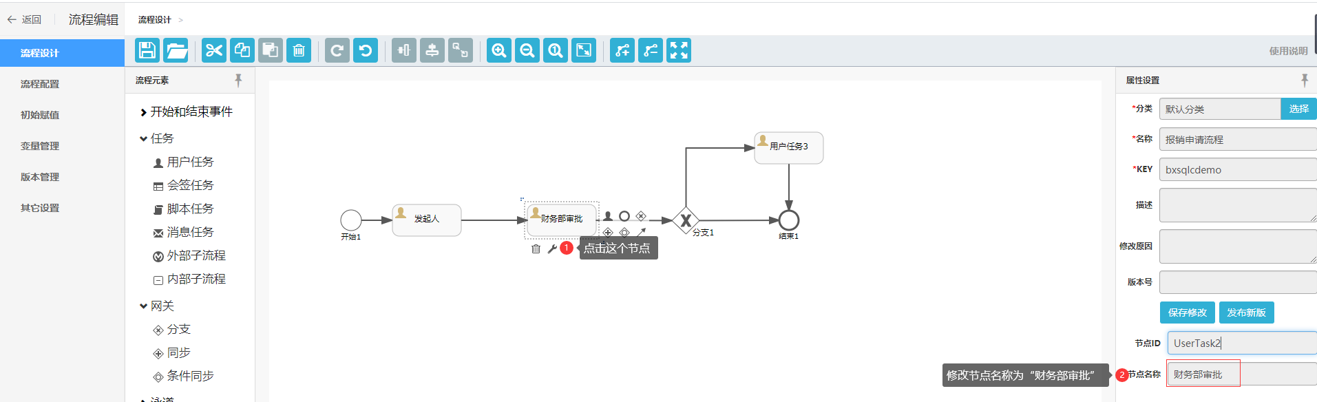 第四步:修改节点名称:将“用户任务2”修改为“财务部审批”