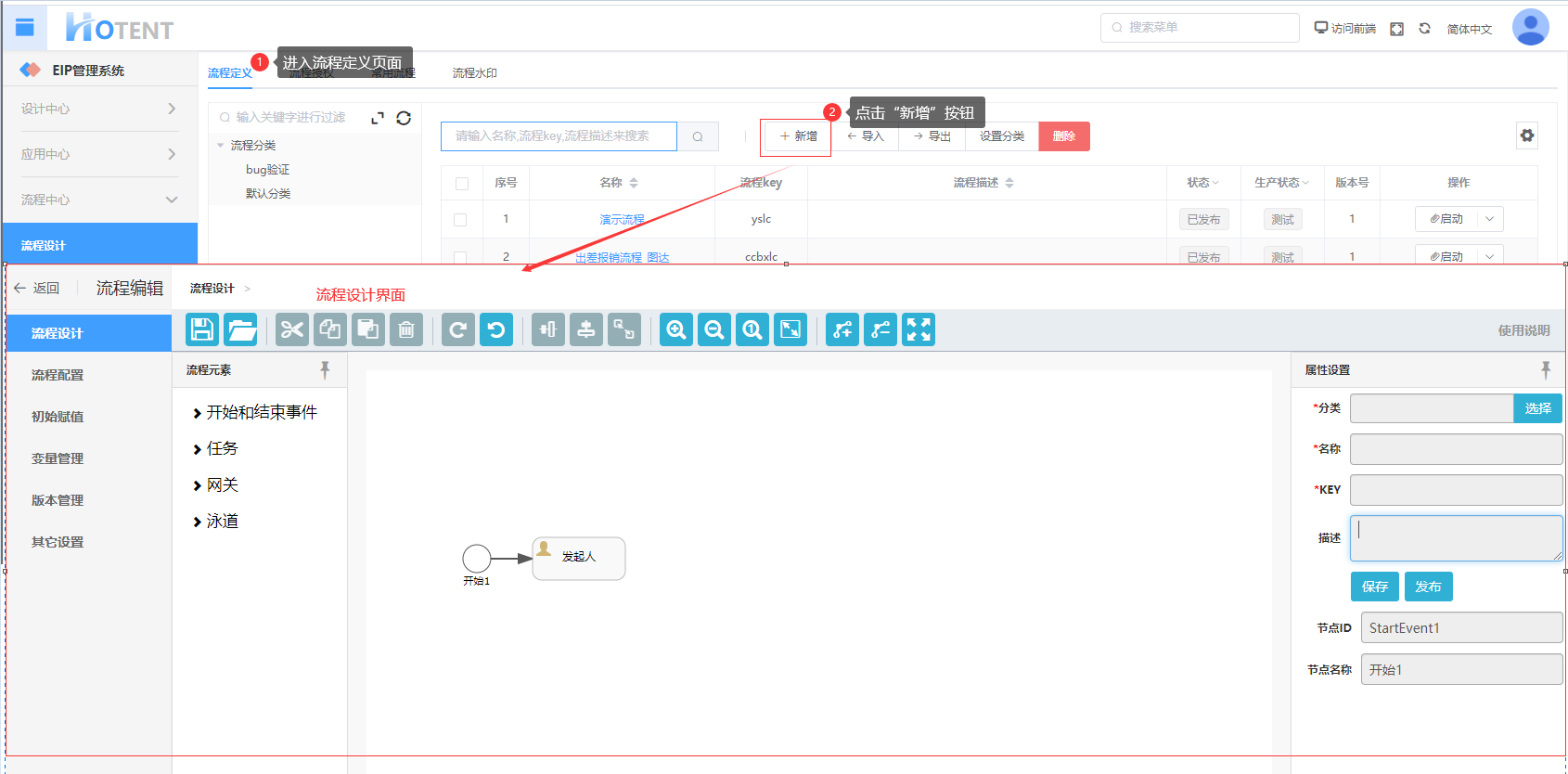 第一步:进入【流程设计】->【流程定义】页面中点击{新增}按钮