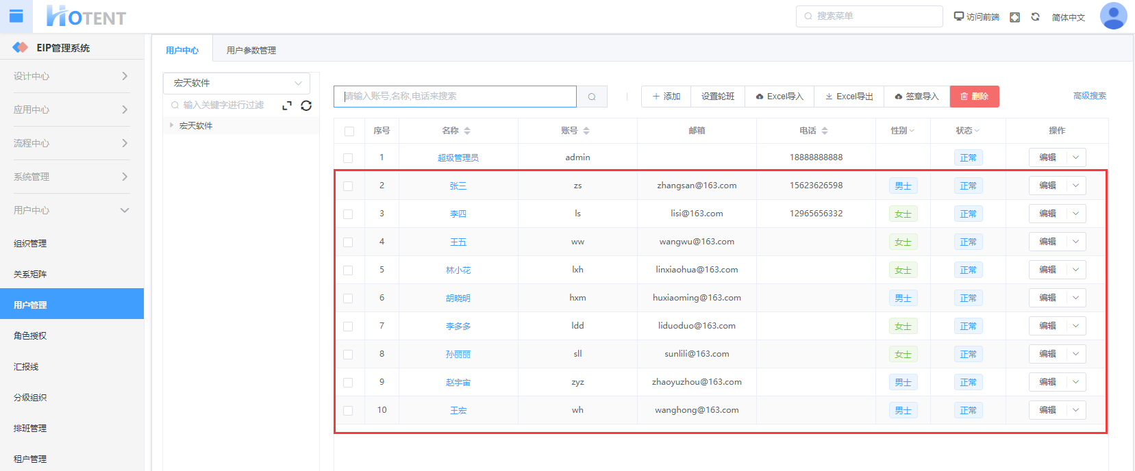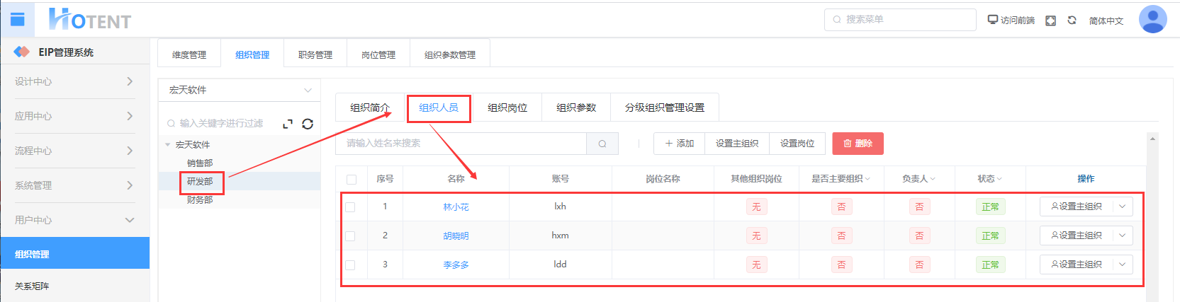 第八步:重复第七步,分别给“研发部”添加组织人员:林小花、胡晓明、李多多;“财务部”添加组织人员:孙丽丽、赵宇宙、王宏;