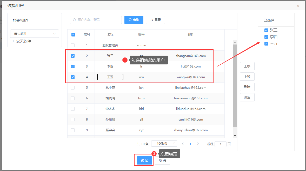 第七步:给组织添加用户:给“销售部”添加组织人员:张三、李四、王五;