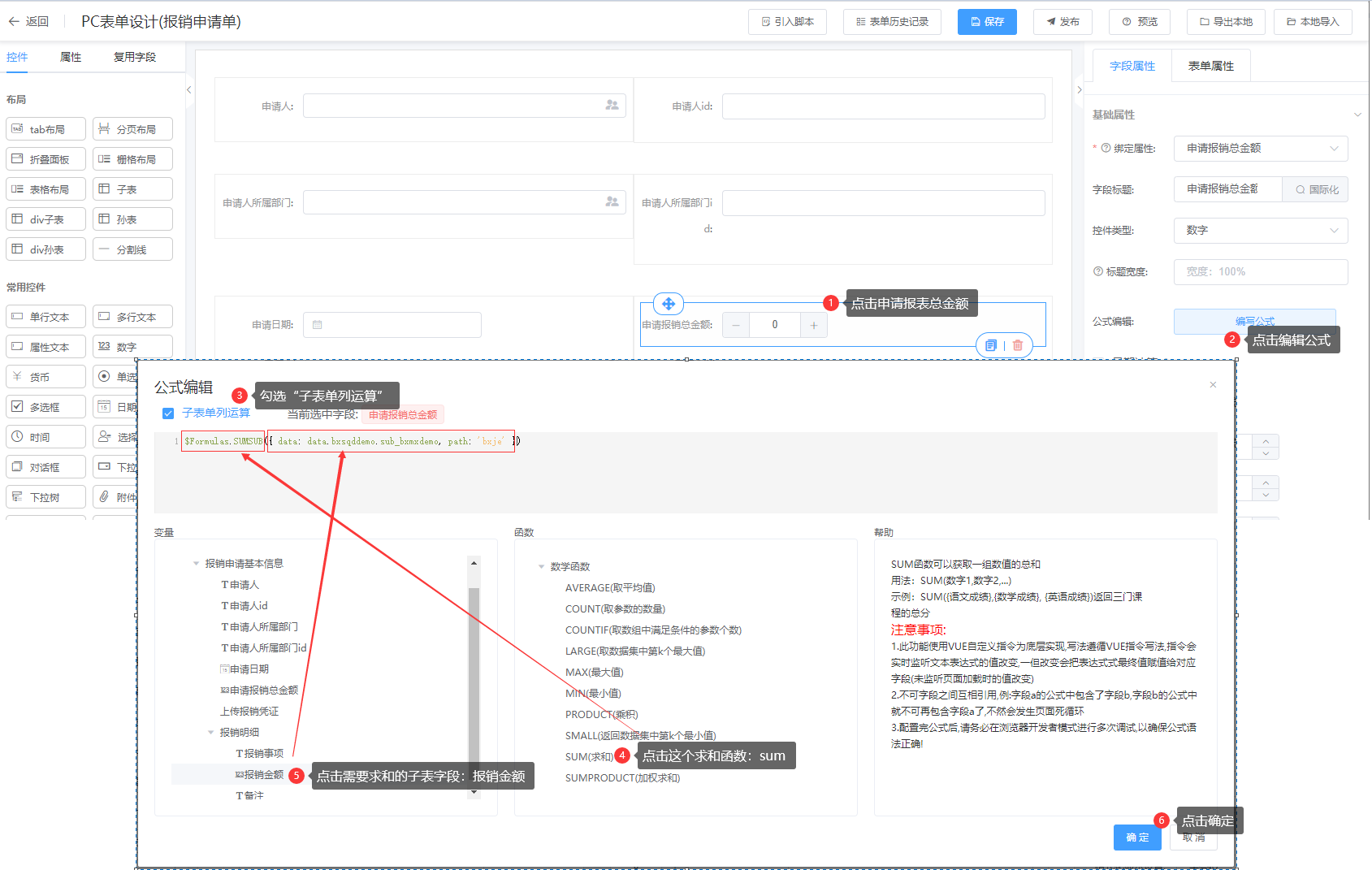 4、设置申请报销总金额自动对子表中“报销金额”这一列的值进行求和: