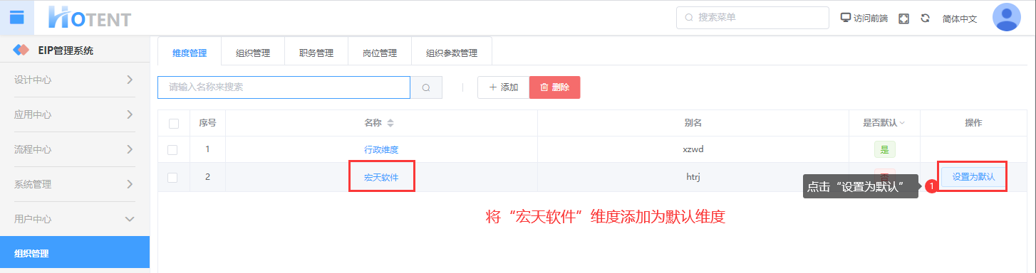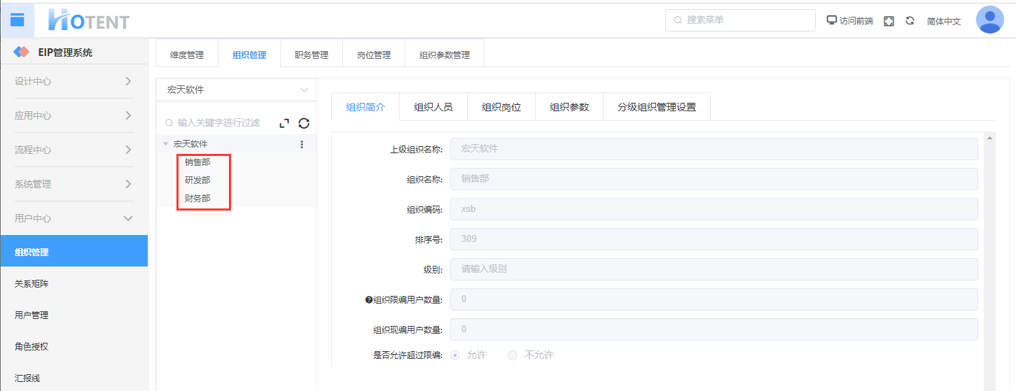 第五步:在宏天软件下添加组织:研发部、财务部、销售部