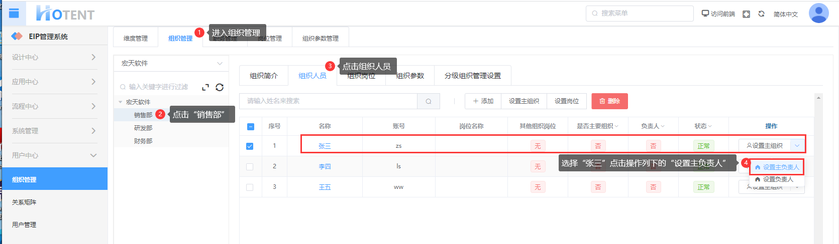 第九步:设置组织主负责人(即部门经理):设置“销售部”的主负责人为“张三”;