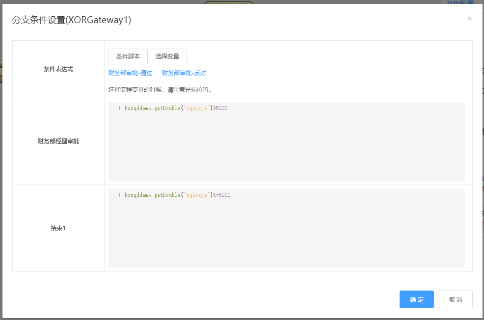 设置分支条件:当报销总金额大于5000时,流转到“财务部经理审批”;