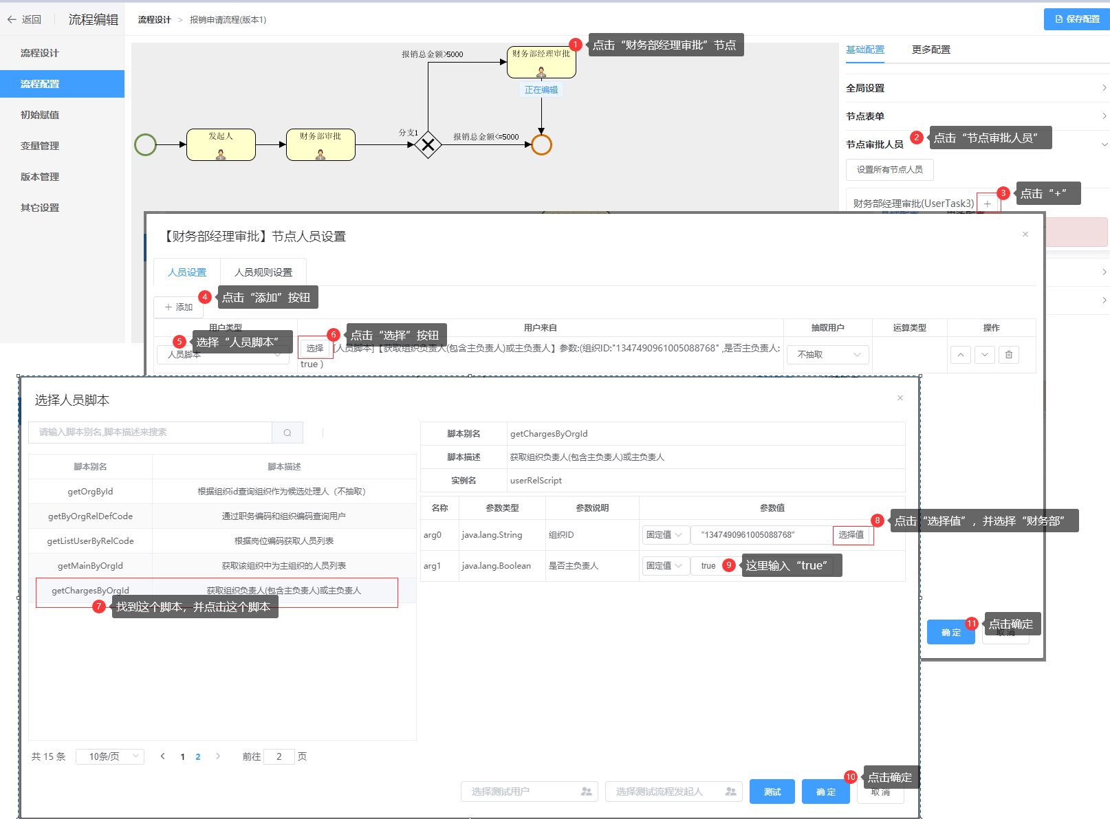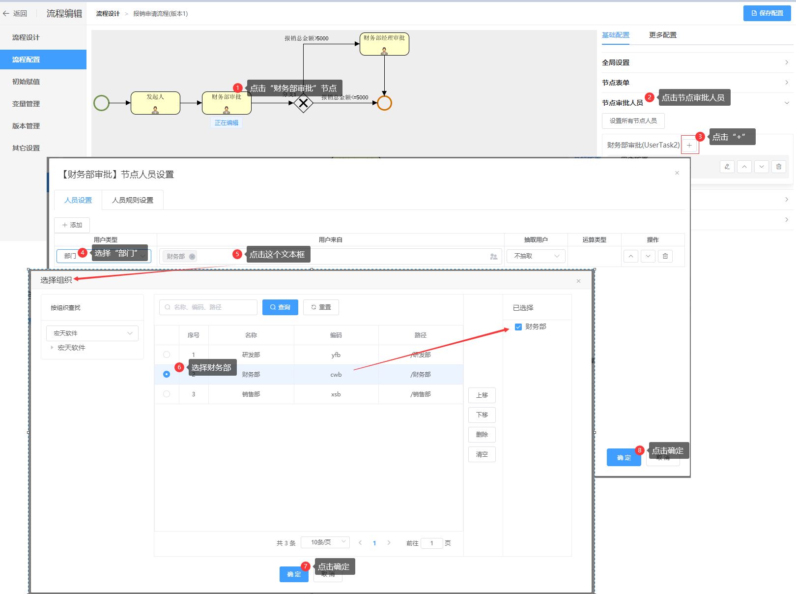 第二步:设置“财务部审批”节点的审批人为“财务部”;