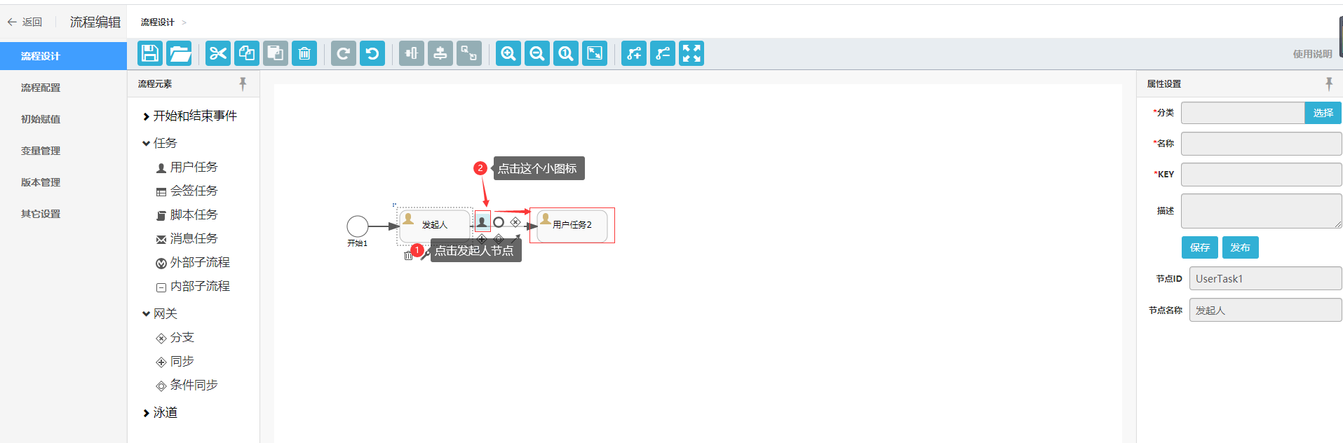 第一步:配置发起人节点的节点审批人为“发起人”;