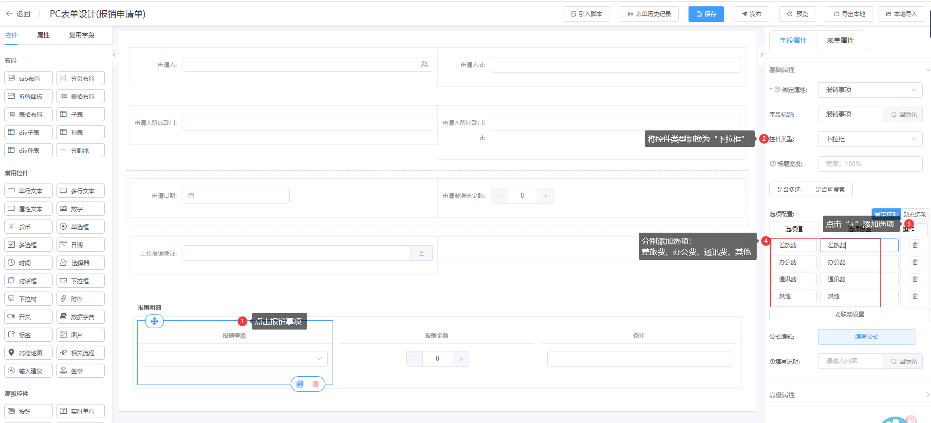 6、设置子表字段-报销事项为下拉框,并且配置固定选项:差旅费、办公费、通讯费、其他,配置步骤如此下图: