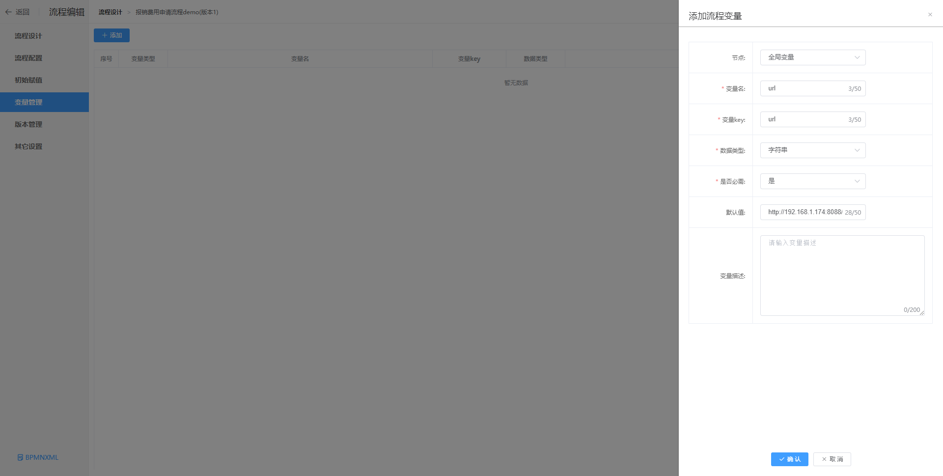 在流程编辑页面,选择变量管理,添加全局变量,设置相应的Key、类型和默认值后保存。如果使用接口启动流程,可以修改变量的值。