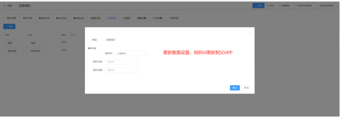 设置更新数据按钮方便批量更新数据用单行文本输入,或者设置组织选择器。