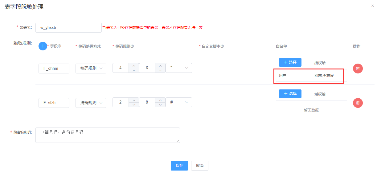 :数据表设置了数据脱敏,对应脱敏的字段是不支持删除与更新数据的;在脱敏配置中,可设置白名单,在白名单上的用户,可修改脱敏的字段内容