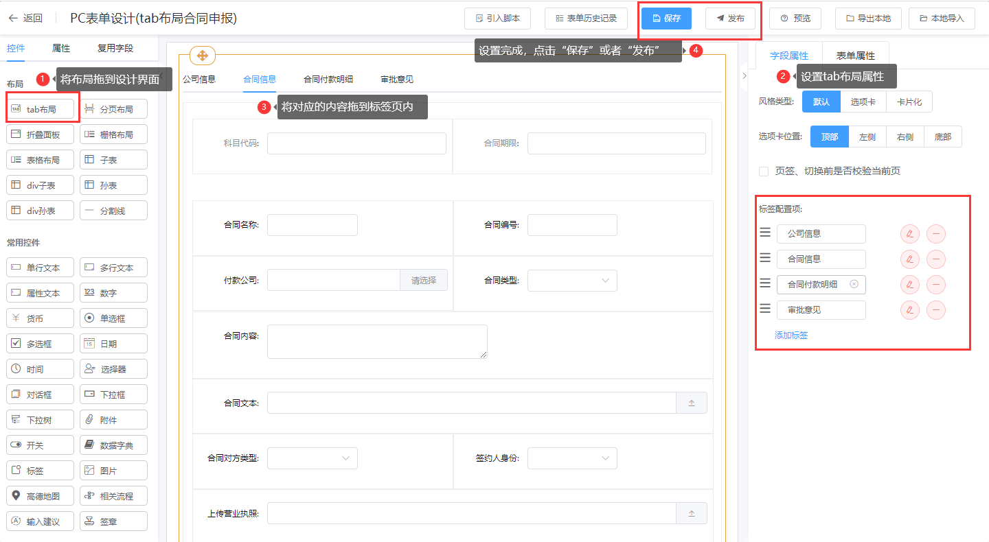 第一步:进入表单设计器页面,将tab布局拖动到设计区域;
