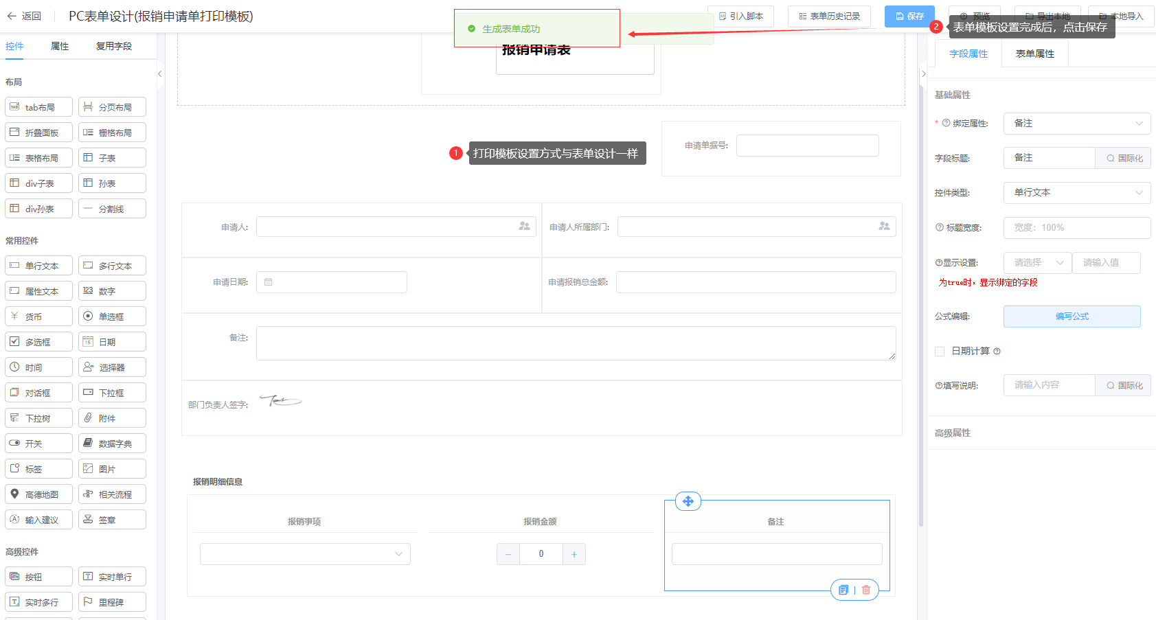 ① 进入【pc表单】,找到“报销申请单”表单,点击操作列下的“设置打印模板”;