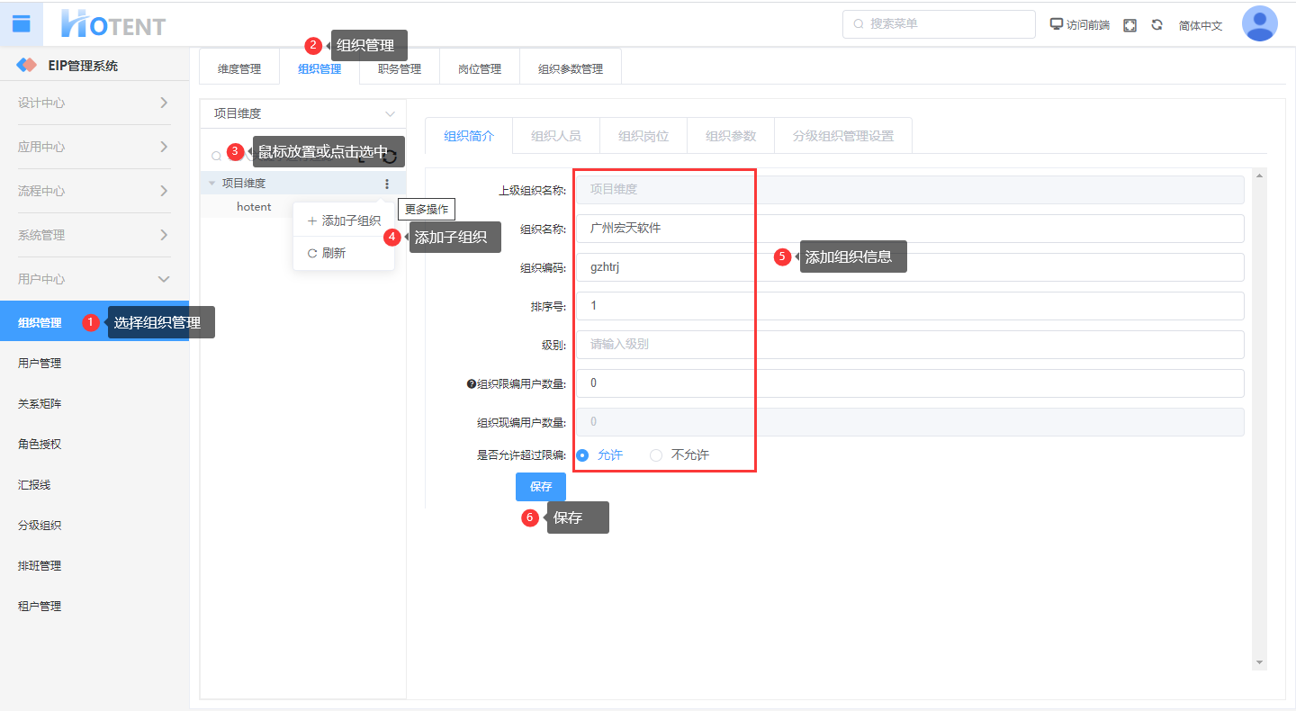 一级操作:【用户中心】→【组织管理】→【组织管理】→点击组织名称→点击“分级组织管理设置”→单击“添加”→点击“保存”