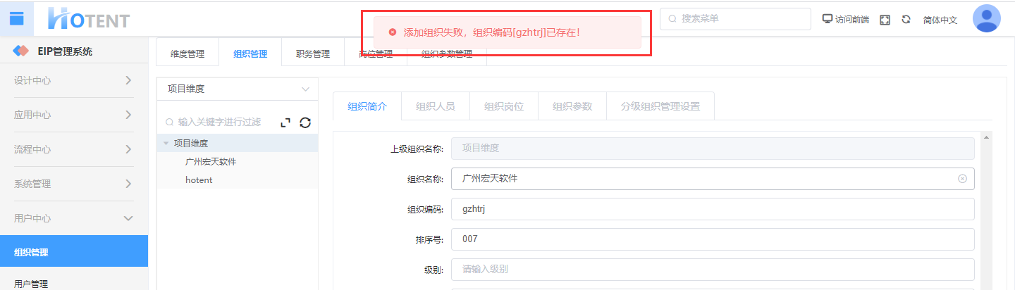 注:组织名称及组织编码为必填项,且组织编码唯一,保存提示如图