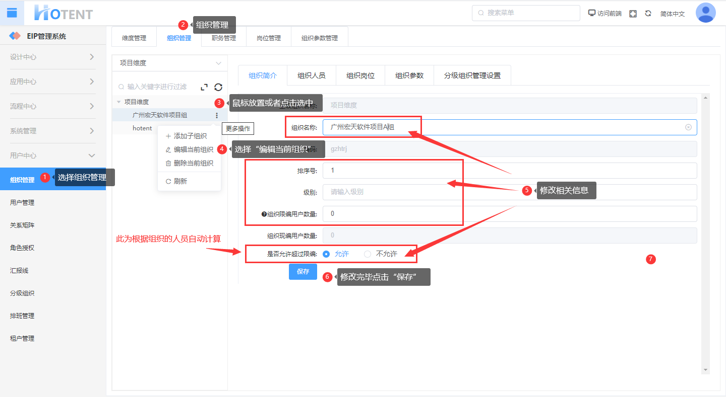 第二步:鼠标光标选择一个组织,点击更多操作,点击“编辑当前组织”
