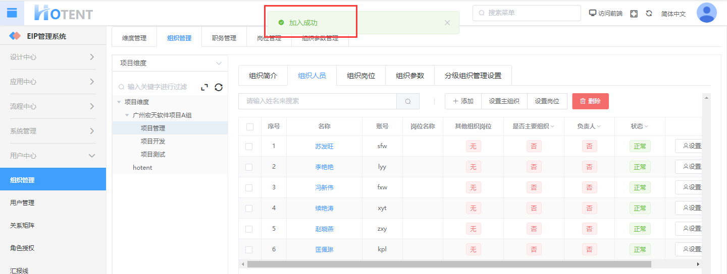 一级操作:【用户中心】→【组织管理】→【组织管理】→点击组织名称→点击“组织人员”→点击“添加”