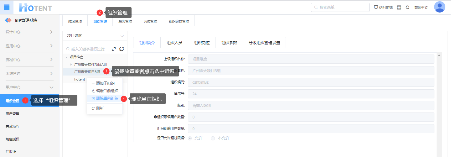 注:删除组织,原通过组织岗位分配带入组织的人员会同步从组织中移除;