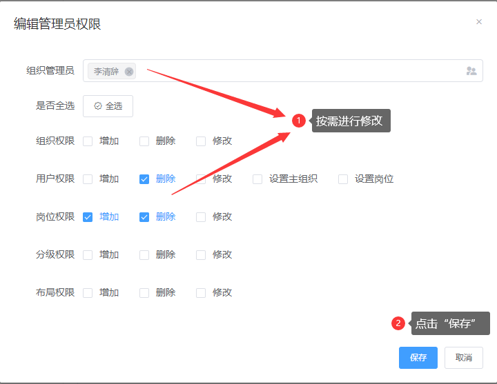 一级操作:【用户中心】→【组织管理】→【组织管理】→点击组织名称→点击“分级组织管理设置”→单击“管理员名称”