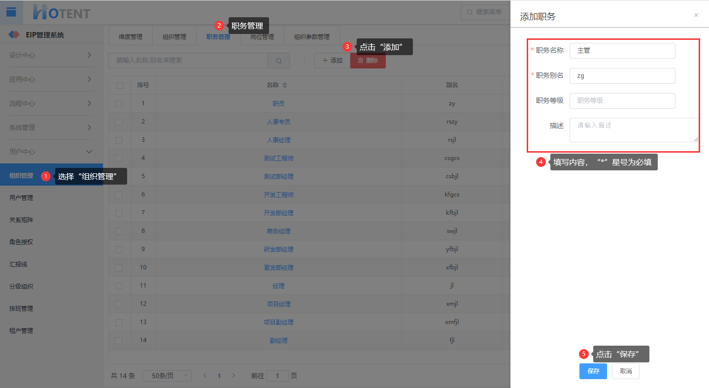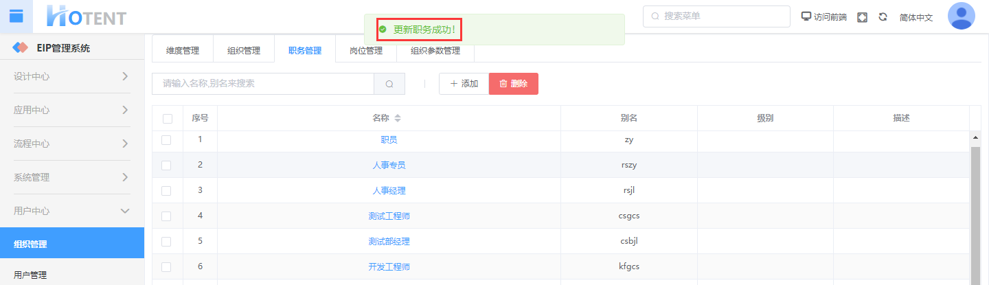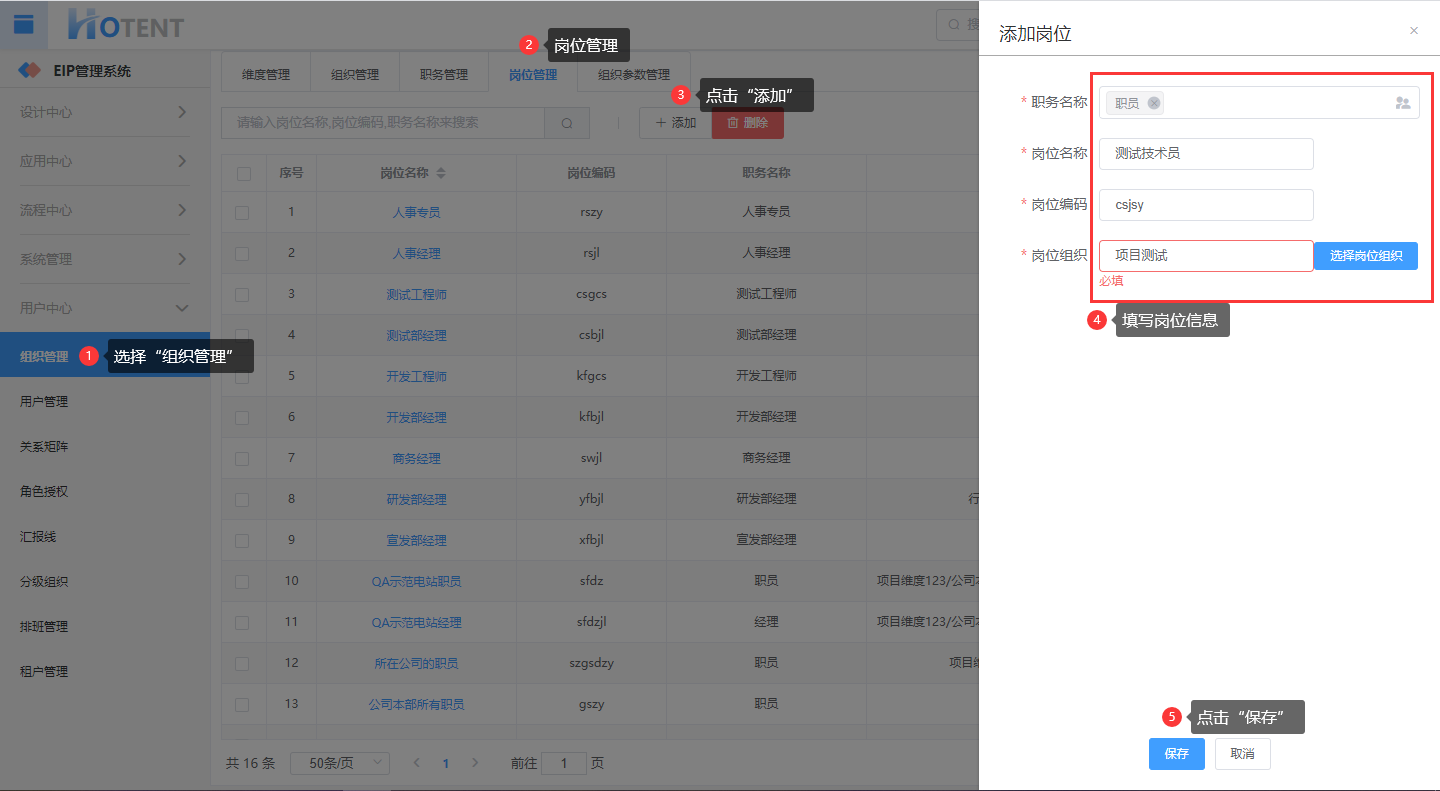 操作:【用户中心】→【组织管理】→【组织管理】→点击组织名称→点击“组织岗位”→点击“添加岗位“→填写岗位信息→点击“保存