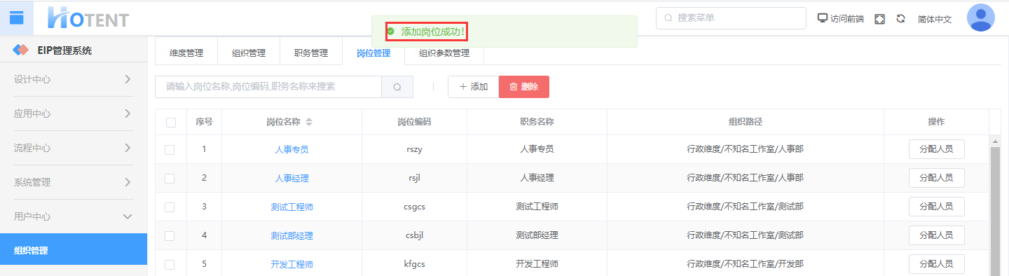 注:通过此操作添加的岗位人员,会同步在【组织管理】→【岗位管理】对应的岗位中