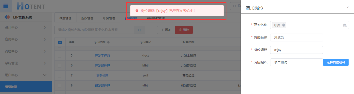 注:编码唯一性,删除岗位为逻辑删除,还存在数据库中,如添加岗位编码与删除岗位编码重复会报错提示,如下图所示,修改岗位编码即可保存成功。