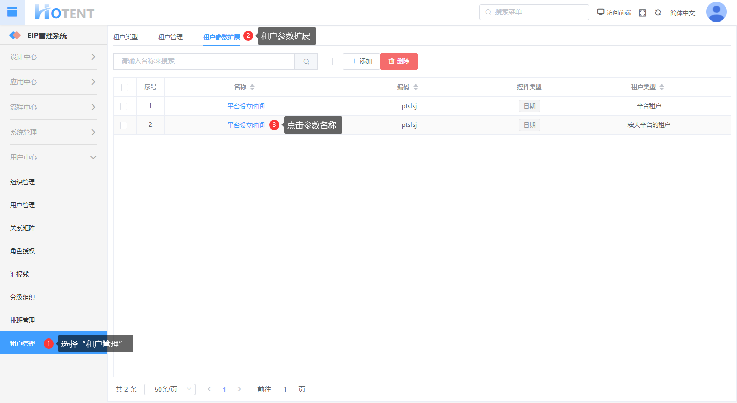 操作:【用户中心】→单击【租户管理】→『租户参数扩展』输入参数名称→点击搜索