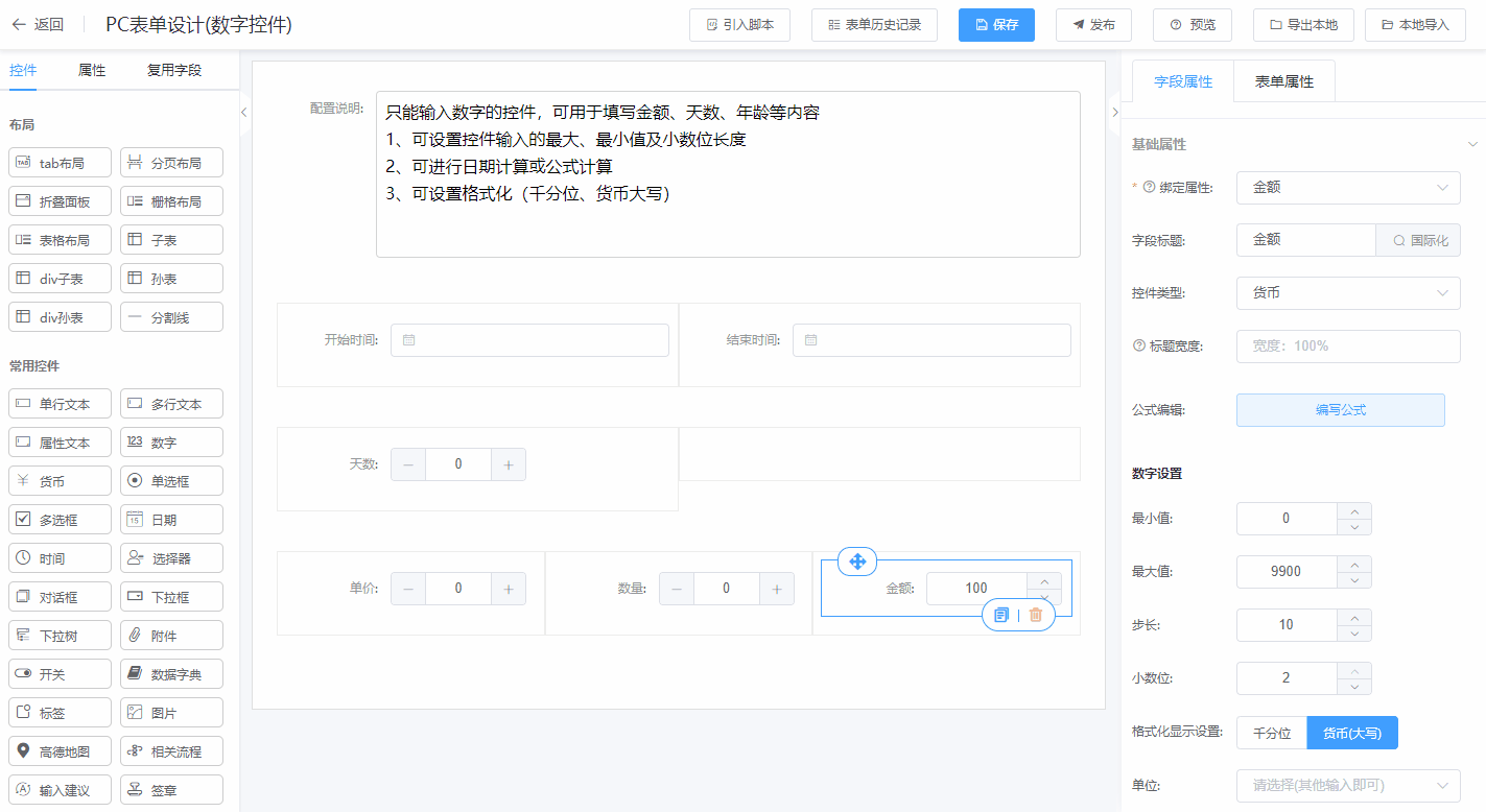 第一步:进入表单设计器页面,将数字控件(货币控件)拖拉到对应的栅格布局中;
