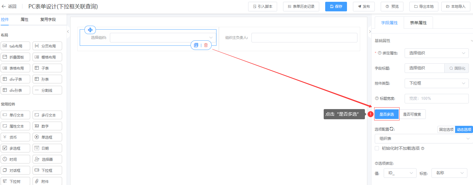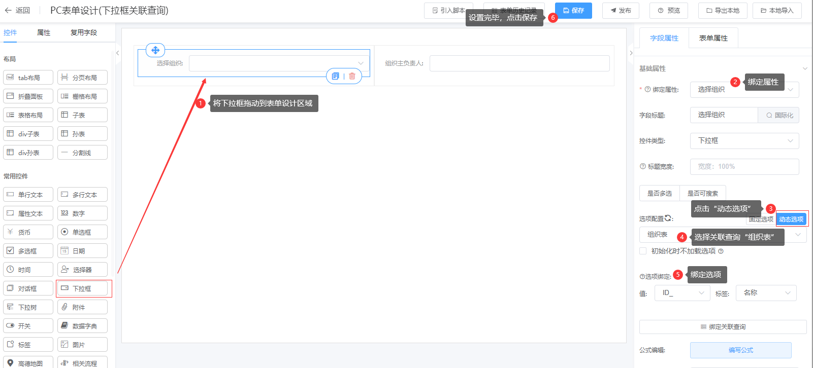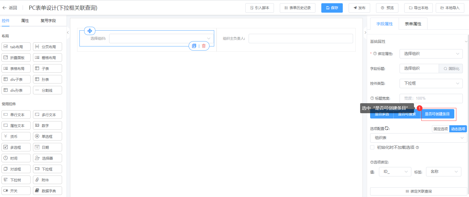 第二步:在表单中-选择组织字段绑定对应的关联查询;