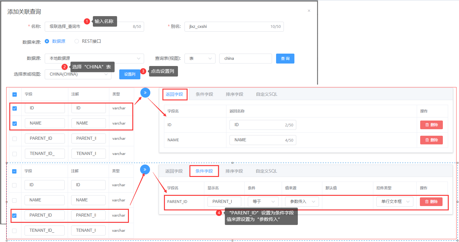 ③ 查询区/乡镇 的这个自定义查询的条件字段一定要有PARENT_ID,如下所示: