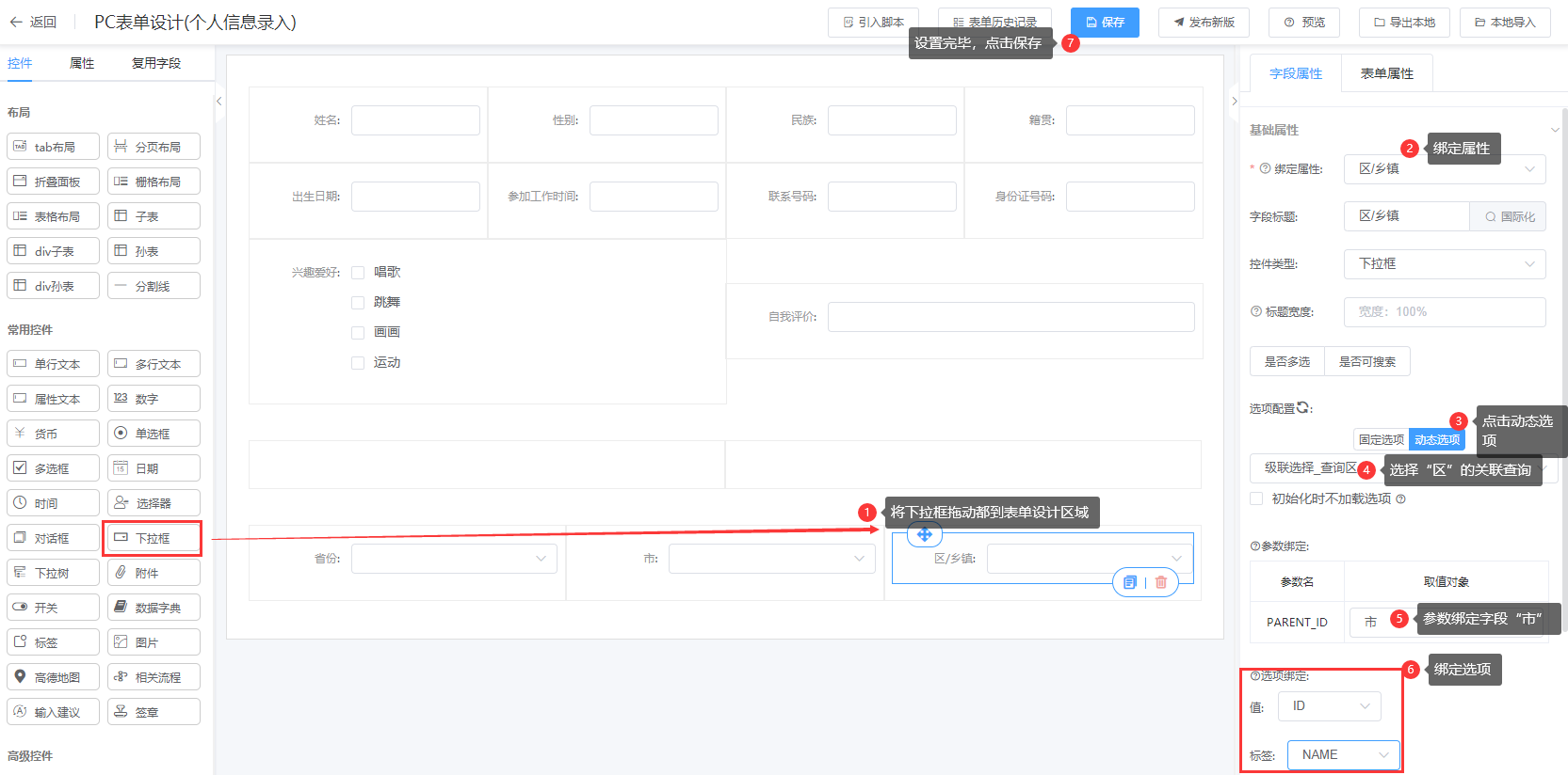 ① 在表单设计页面中设置下拉框的级联,下拉框的级联是通过设置动态选项实现的。省份这个字段使用控件下拉框,下拉框使用动态选项,然后选择关联查询:级联选择_查询省。