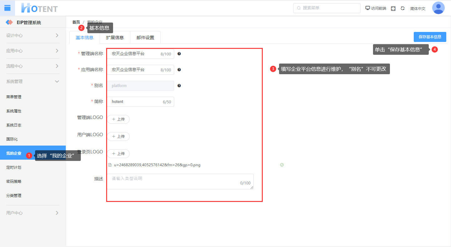 操作:【系统管理】→【企业信息】→ 【基本信息】→ 单击“保存邮件信息”
