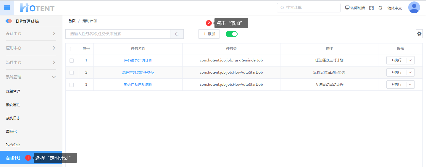 操作:【系统管理】→【定时计划】→单击“添加“→填写计划信息→单击“保存”;