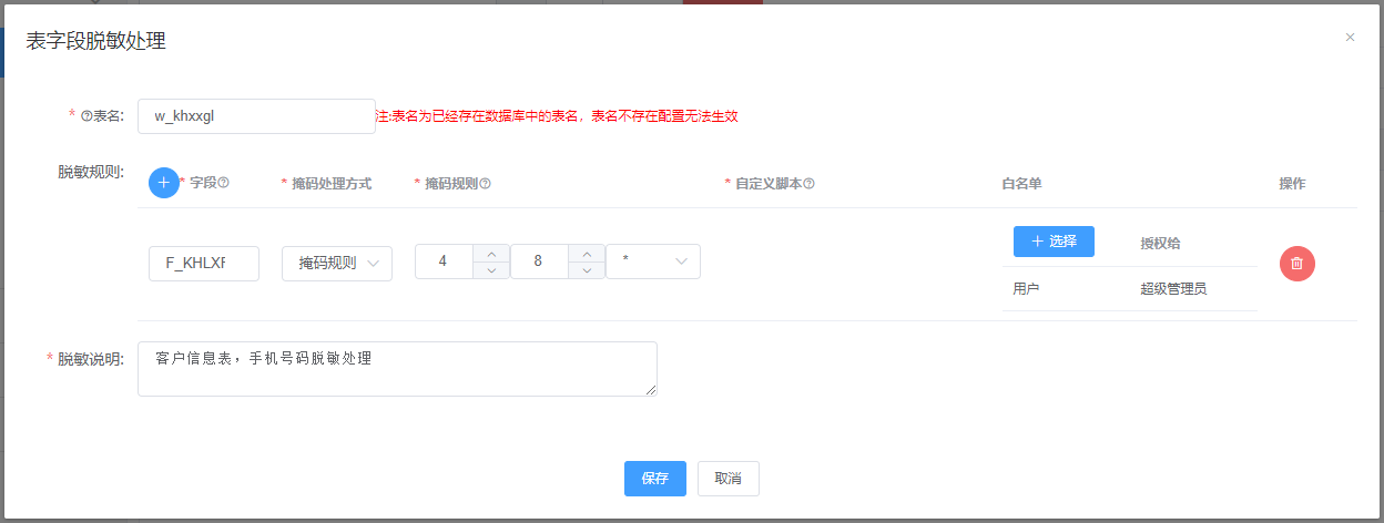 注:白名单中的用户可查看该字段的全部内容,不受掩码规则限制
