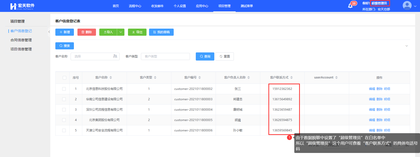 注:不在数据脱敏中的白名单的用户,对“客户联系方式”这个字段进行修改是不生效的