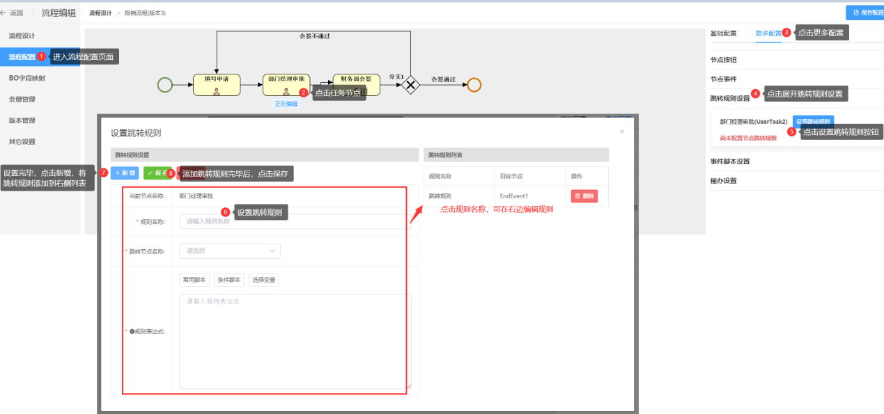 在系统中可以给任务节点设置跳转规则,即某个节点的任务达到设置的条件后,对该任务执行设置的相应动作。