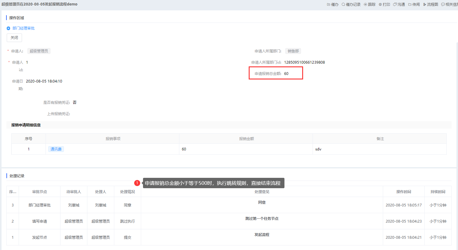 报销申请流程,表单内容“报销申请总金额”小于等于500时,跳过“总经理审批”环境,直接结束流程,流程图如下所示: