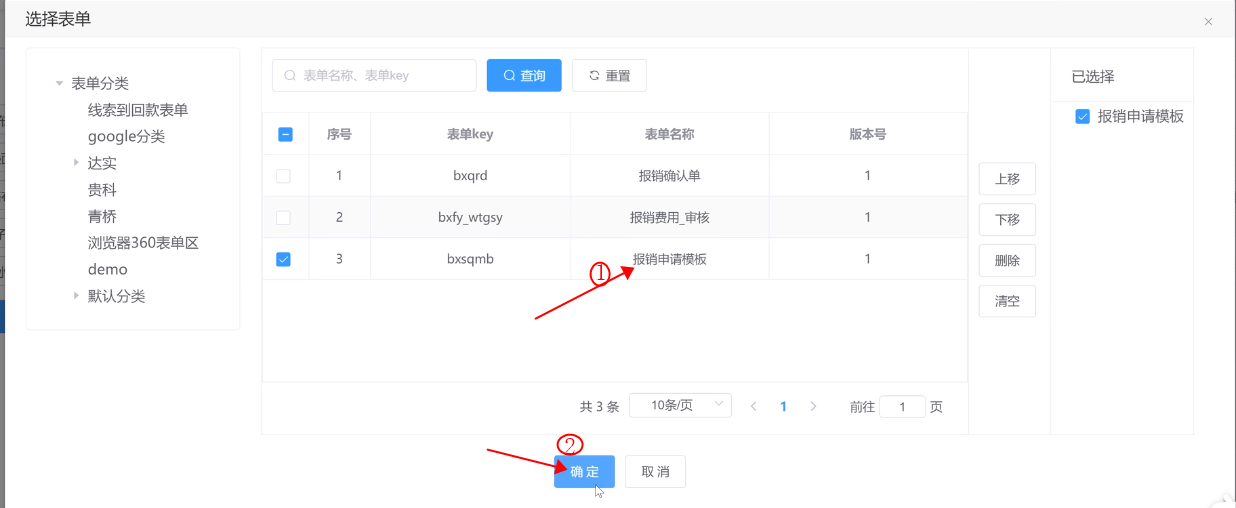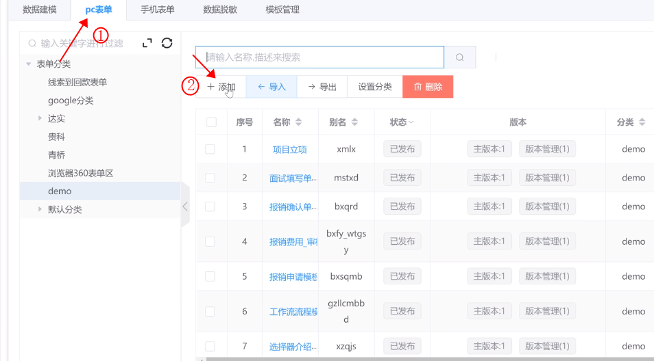 第一步:进入PC表单页面,点击添加,选择报销申请模板,点击确认;选择空模板,点确认;