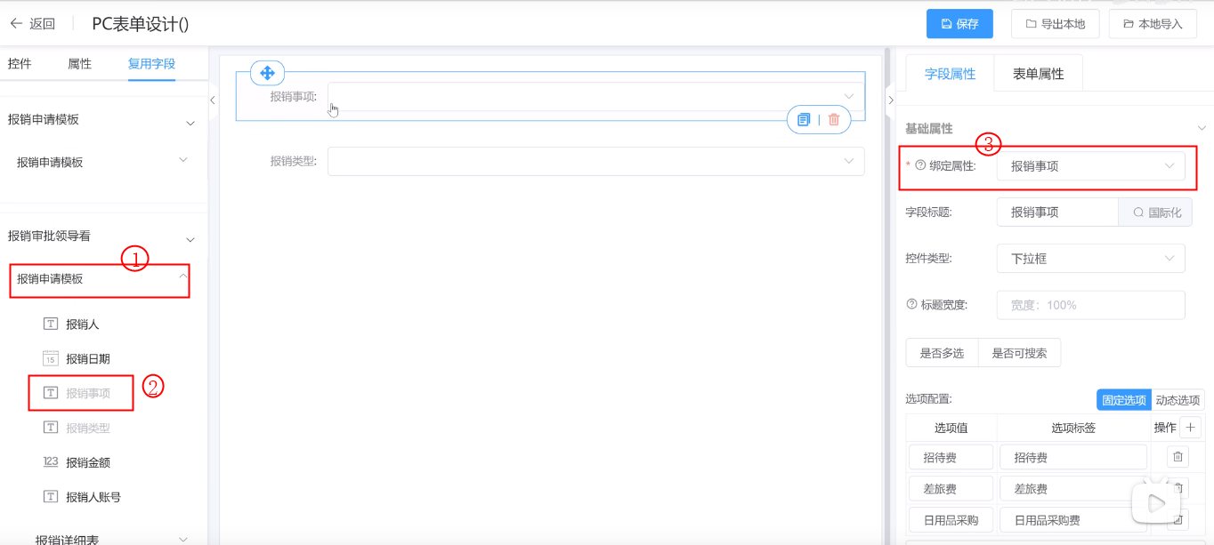 实例说明:例如需要创建两个报销申请单时,表单A是手动添加配置好所有控件的已存的表单,表单B只需要部分控件时可复用表单A已经配置好的控件;复杂的控件例如下拉框配置动态选项、设置关联查询,不想再配置一遍,则可以选择复用字段;