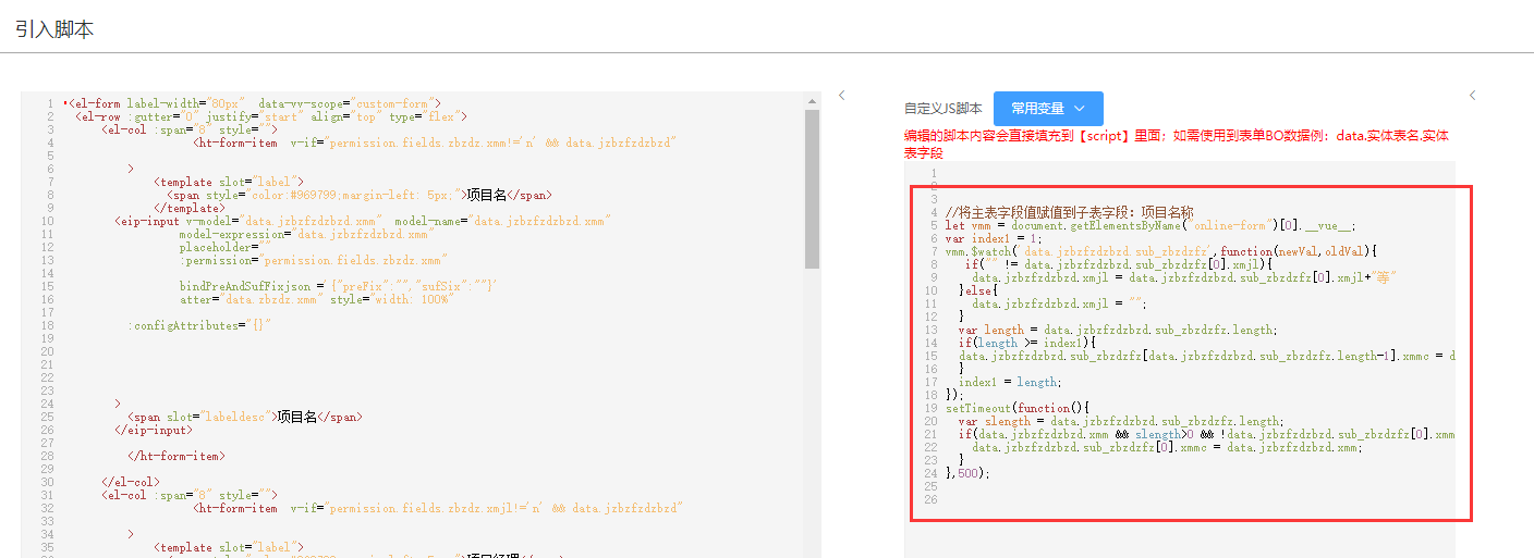 示例说明:通过js方法汇总子表项目备注到主表项目备注字段,用中文逗号拼接