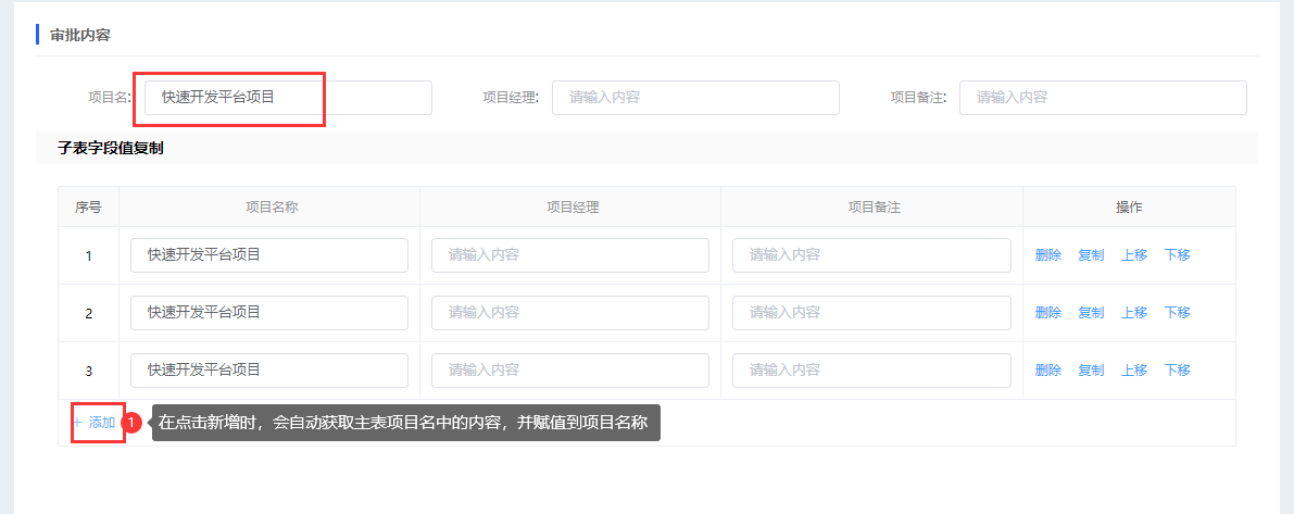 示例说明:通过js方法将主表中的项目名称赋值到子表的项目名称中