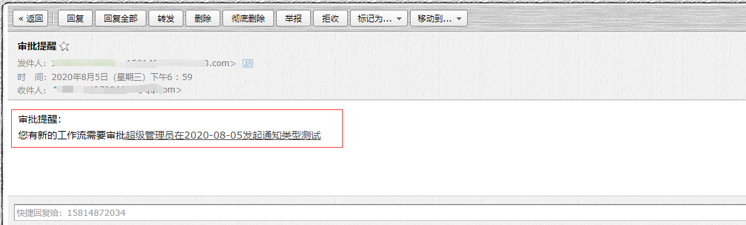 通知类型:流程产生待办时的通知类型(用于正式流程,即“生产状态”处于正式的流程)(此处设置测通知类型,在每个节点产生的待办都会发送消息通知给待审批人)。