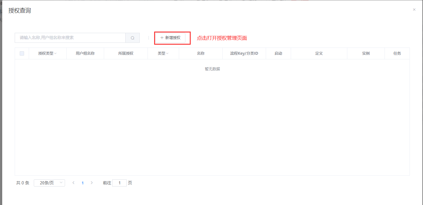 在每条流程后可以通过点击授权管理,快速进行授权配置,具体配置操作请参考流程授权配置模块功能