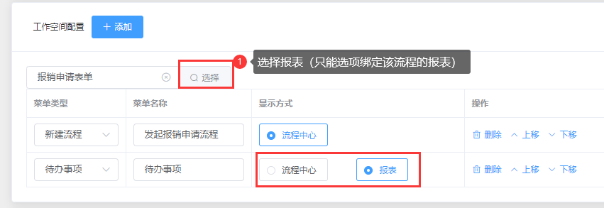 显示方式包括:流程中心、报表;如下图:
