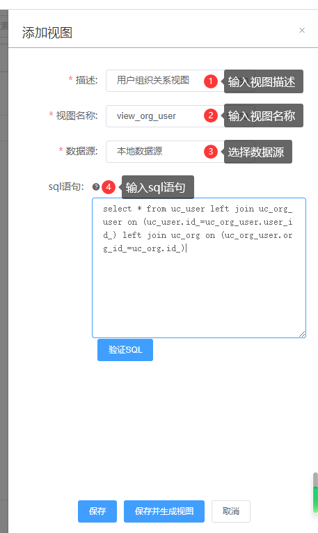 第三步:验证sql,若通过验证,点击保存并生成视图