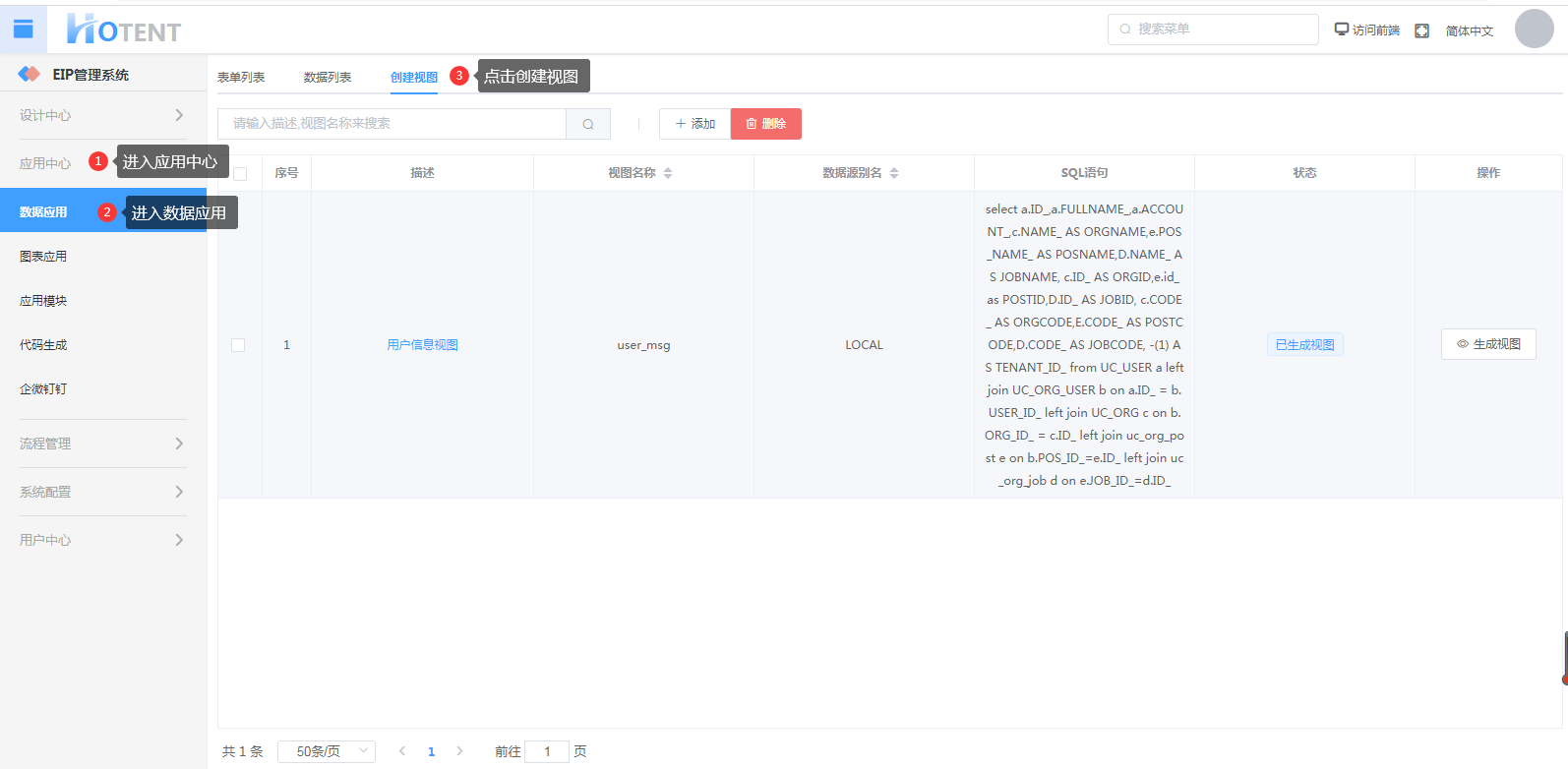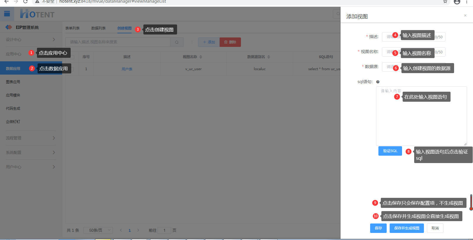 1、 添加视图后,点击保存,此时是没有在数据库生成视图的,点击操作列下的生成视图按钮可生成视图;操作如下: