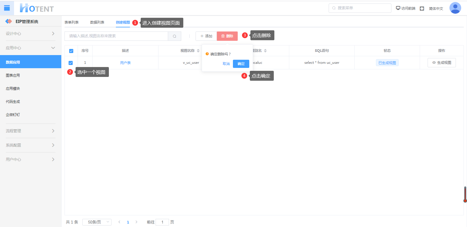 注:此处的删除只是删除这条数据,并不会删除到数据库中已生成的视图;