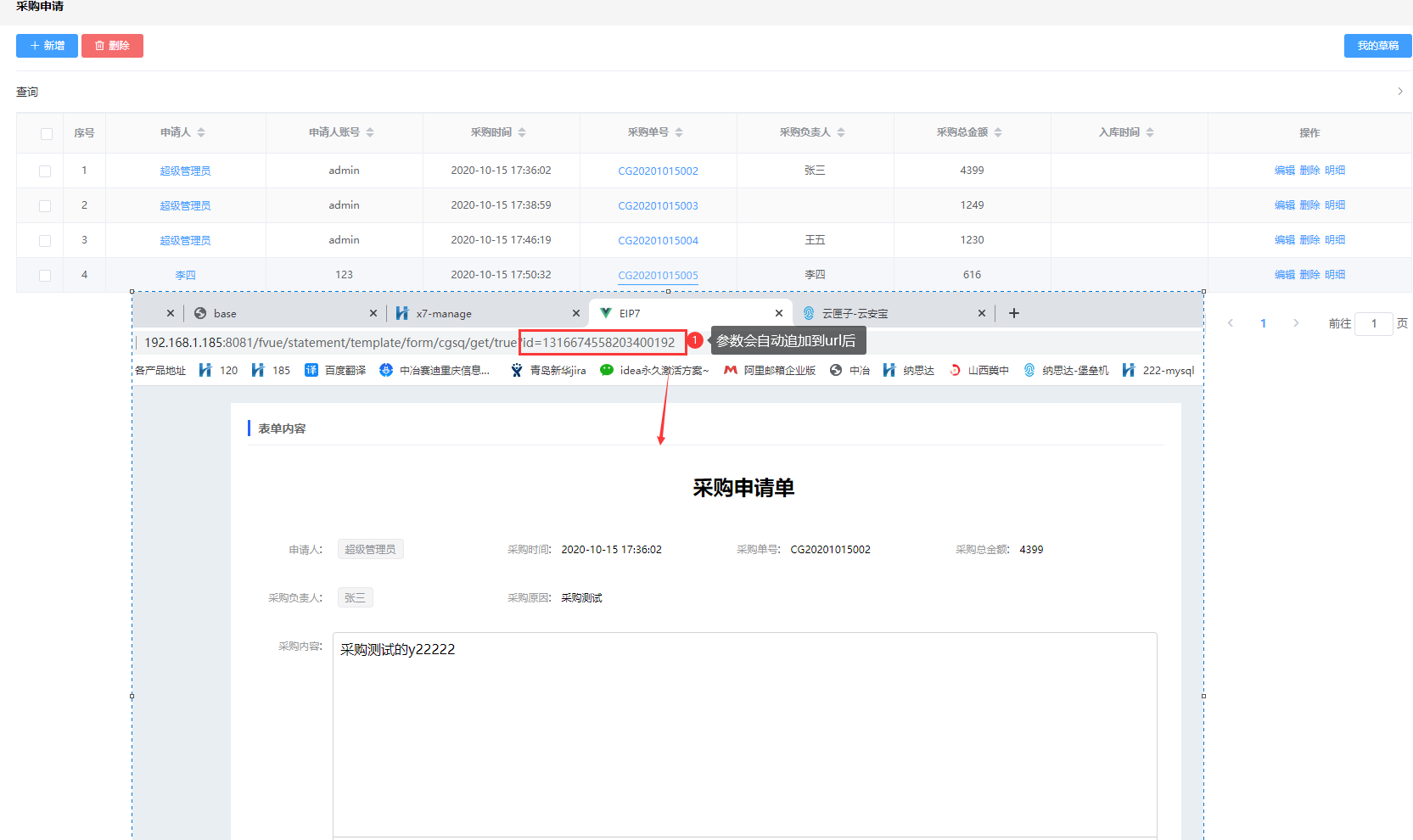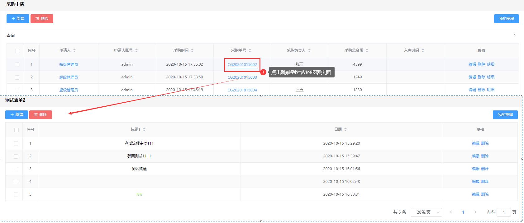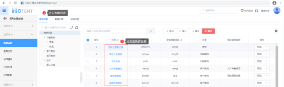 将表单添加为表单列表,列表中显示表单对应数据建模在数据库物理表中存放的所有数据,可对列表数据进行增删改查等操作;