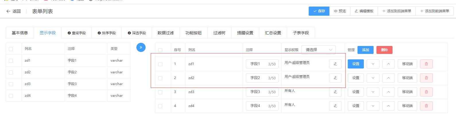 1、 显示权限:如设置字段1、字段2只有超级管理员可见;