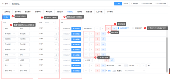 第八步:配置功能按钮编辑和明细,在编辑按钮中配置表单权限,只能编辑子表的信息,主表的信息不允许修改;