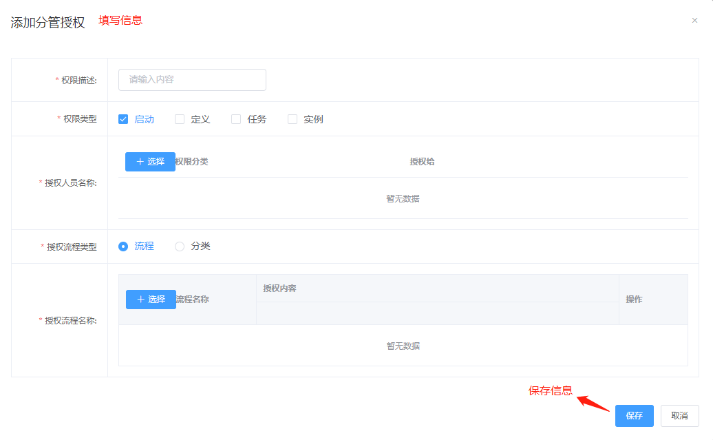 用户在【流程列表】页面添加流程后,除了超级管理员和添加该流程的用户可以在启动该流程,可以在【流程管理】【流程列表】中看到该流程定义,对该流程进行其他操作,可以在【任务管理】和【实例管理】中看到该流程的任务和实例,其他用户都只有在【分管授权】中进行授权后才可以有这条流程相应的操作权限。